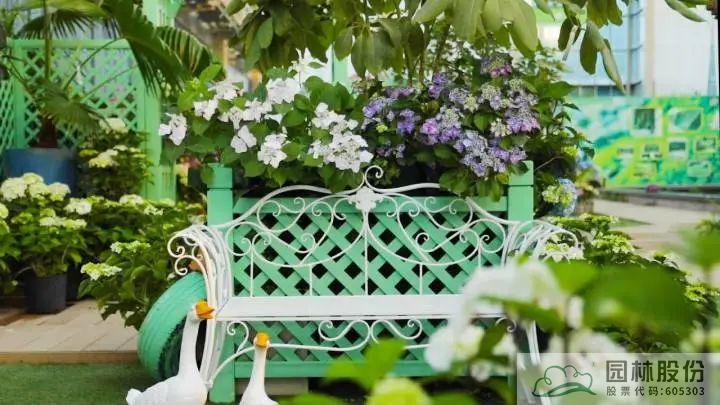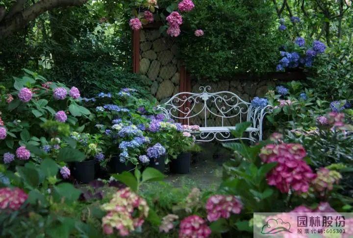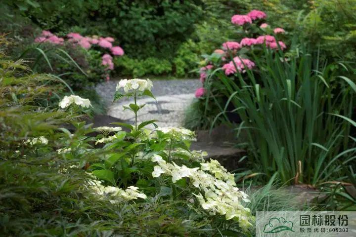 ▲园林股份自主选育的‘青山’系列绣球在画境·青山湖花园中心室外景观展示区中的应用